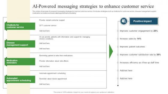 This slides showcases AI powered messaging strategies to improve customer service. It includes strategies such as chatbots for customer service, disease management support, medication reminders and automated appointment scheduling. Get a simple yet stunning designed AI Powered Messaging Strategies Pharmaceutical Promotional Strategies To Drive Business Sales Microsoft Pdf. It is the best one to establish the tone in your meetings. It is an excellent way to make your presentations highly effective. So, download this PPT today from Slidegeeks and see the positive impacts. Our easy to edit AI Powered Messaging Strategies Pharmaceutical Promotional Strategies To Drive Business Sales Microsoft Pdf can be your go to option for all upcoming conferences and meetings. So, what are you waiting for Grab this template today. This slides showcases AI powered messaging strategies to improve customer service. It includes strategies such as chatbots for customer service, disease management support, medication reminders and automated appointment scheduling.