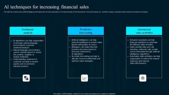 This slide showcases various artificial intelligence techniques that can help organization to increase the sales of financial products. Various techniques are sentiment analysis, automated sales activities and predictive forecasting. Boost your pitch with our creative AI Techniques For Increasing Financial Sales Download Pdf. Deliver an awe-inspiring pitch that will mesmerize everyone. Using these presentation templates you will surely catch everyones attention. You can browse the ppts collection on our website. We have researchers who are experts at creating the right content for the templates. So you do not have to invest time in any additional work. Just grab the template now and use them. This slide showcases various artificial intelligence techniques that can help organization to increase the sales of financial products. Various techniques are sentiment analysis, automated sales activities and predictive forecasting.