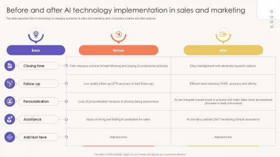 The slide describes how AI technology is changing scenarios of sales and marketing area. It provides a before and after analysis. Find a pre-designed and impeccable Before And After AI Technology Implementation In Sales And Marketing PPT Sample SS. The templates can ace your presentation without additional effort. You can download these easy-to-edit presentation templates to make your presentation stand out from others. So, what are you waiting for Download the template from Slidegeeks today and give a unique touch to your presentation. The slide describes how AI technology is changing scenarios of sales and marketing area. It provides a before and after analysis.