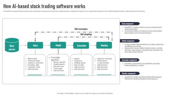 This slide showcases framework that can help organization to analyze the functioning AI-based software for algorithmic trading. Its key components are data sources, artificial intelligence mode, trade execution and monitoring. Presenting this PowerPoint presentation, titled How AI Based Stock Trading Software Works Topics Pdf, with topics curated by our researchers after extensive research. This editable presentation is available for immediate download and provides attractive features when used. Download now and captivate your audience. Presenting this How AI Based Stock Trading Software Works Topics Pdf. Our researchers have carefully researched and created these slides with all aspects taken into consideration. This is a completely customizable How AI Based Stock Trading Software Works Topics Pdf that is available for immediate downloading. Download now and make an impact on your audience. Highlight the attractive features available with our PPTs. This slide showcases framework that can help organization to analyze the functioning AI-based software for algorithmic trading. Its key components are data sources, artificial intelligence mode, trade execution and monitoring.