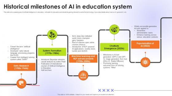 This slide showcases types of artificial intelligence in education, referable for educators and students gaining interest towards this technology. It provides details about narrow AI, general AI, etc. Take your projects to the next level with our ultimate collection of Historical Milestones Of AI In Education System Educational Transformation Through AI SS V. Slidegeeks has designed a range of layouts that are perfect for representing task or activity duration, keeping track of all your deadlines at a glance. Tailor these designs to your exact needs and give them a truly corporate look with your own brand colors they will make your projects stand out from the rest This slide showcases types of artificial intelligence in education, referable for educators and students gaining interest towards this technology. It provides details about narrow AI, general AI, etc.