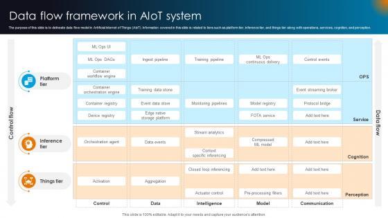 The purpose of this slide is to delineate data flow model in Artificial Internet of Things AIoT. Information covered in this slide is related to tiers such as platform tier, inference tier, and things tier along with operations, services, cognition, and perception. If your project calls for a presentation, then Slidegeeks is your go-to partner because we have professionally designed, easy-to-edit templates that are perfect for any presentation. After downloading, you can easily edit Integrating AI With IoT Data Flow Framework In AIoT System IoT SS V and make the changes accordingly. You can rearrange slides or fill them with different images. Check out all the handy templates The purpose of this slide is to delineate data flow model in Artificial Internet of Things AIoT. Information covered in this slide is related to tiers such as platform tier, inference tier, and things tier along with operations, services, cognition, and perception.