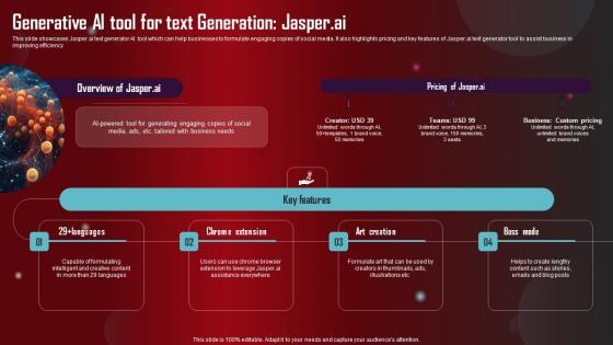 This slide showcases Jasper.ai text generator AI tool which can help businesses to formulate engaging copies of social media. It also highlights pricing and key features of Jasper.ai text generator tool to assist business in improving efficiency The best PPT templates are a great way to save time, energy, and resources. Slidegeeks have 100 percent editable powerpoint slides making them incredibly versatile. With these quality presentation templates, you can create a captivating and memorable presentation by combining visually appealing slides and effectively communicating your message. Download Generative AI Tool For Text Generation Role Of Generative AI Tools Across Background Pdf from Slidegeeks and deliver a wonderful presentation. This slide showcases Jasper.ai text generator AI tool which can help businesses to formulate engaging copies of social media. It also highlights pricing and key features of Jasper.ai text generator tool to assist business in improving efficiency