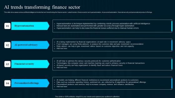 This slide showcases various artificial intelligence trends that are transforming the finance sector. Latest trends in finance sector are hyperautomation, AI-powered automation, financial security and personalized product offerings.Welcome to our selection of the Ai Trends Transforming Finance Sector Artificial Intelligence Applications Ideas Pdf. These are designed to help you showcase your creativity and bring your sphere to life. Planning and Innovation are essential for any business that is just starting out. This collection contains the designs that you need for your everyday presentations. All of our PowerPoints are 100Precent editable, so you can customize them to suit your needs. This multi-purpose template can be used in various situations. Grab these presentation templates today. This slide showcases various artificial intelligence trends that are transforming the finance sector. Latest trends in finance sector are hyperautomation, AI powered automation, financial security and personalized product offerings.