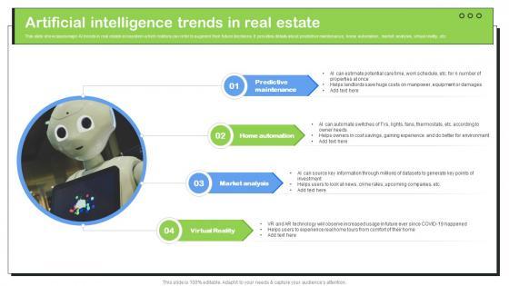This slide showcases major AI trends in real estate ecosystem which realtors can refer to augment their future decisions. It provides details about predictive maintenance, home automation, market analysis, virtual reality, etc. Get a simple yet stunning designed Transforming Real Estate Artificial Intelligence Trends In Real Estate ChatGPT SS V. It is the best one to establish the tone in your meetings. It is an excellent way to make your presentations highly effective. So, download this PPT today from Slidegeeks and see the positive impacts. Our easy-to-edit Transforming Real Estate Artificial Intelligence Trends In Real Estate ChatGPT SS V can be your go-to option for all upcoming conferences and meetings. So, what are you waiting for Grab this template today. This slide showcases major AI trends in real estate ecosystem which realtors can refer to augment their future decisions. It provides details about predictive maintenance, home automation, market analysis, virtual reality, etc.
