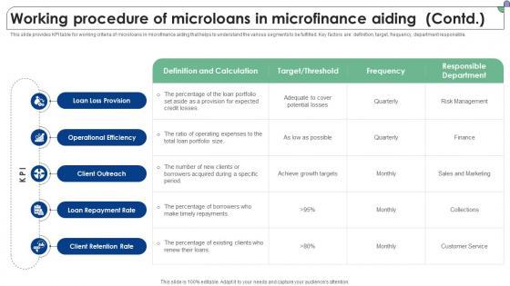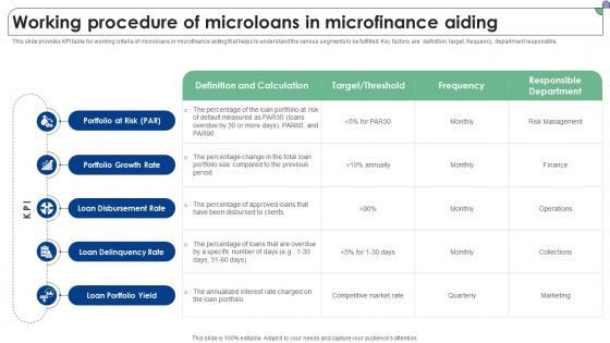 This slide provides KPI table for working criteria of microloans in microfinance aiding that helps to understand the various segments to be fulfilled. Key factors are definition, target, frequency, department responsible. This Working Procedure Of Microloans In Microfinance Aiding Complete Guide To Microfinance Fin SS V is perfect for any presentation, be it in front of clients or colleagues. It is a versatile and stylish solution for organizing your meetings. The Working Procedure Of Microloans In Microfinance Aiding Complete Guide To Microfinance Fin SS V features a modern design for your presentation meetings. The adjustable and customizable slides provide unlimited possibilities for acing up your presentation. Slidegeeks has done all the homework before launching the product for you. So, do not wait, grab the presentation templates today This slide provides KPI table for working criteria of microloans in microfinance aiding that helps to understand the various segments to be fulfilled. Key factors are definition, target, frequency, department responsible.