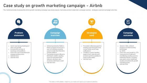 The mentioned slide showcases the Airbnb growth marketing campaign case study analysis. It provides problem statement, campaign overview , strategies used and campaign outcomes. Create an editable A Comprehensive Approach To Case Study On Growth Marketing Campaign Airbnb MKT SS V that communicates your idea and engages your audience. Whether you are presenting a business or an educational presentation, pre-designed presentation templates help save time. A Comprehensive Approach To Case Study On Growth Marketing Campaign Airbnb MKT SS V is highly customizable and very easy to edit, covering many different styles from creative to business presentations. Slidegeeks has creative team members who have crafted amazing templates. So, go and get them without any delay. The mentioned slide showcases the Airbnb growth marketing campaign case study analysis. It provides problem statement, campaign overview , strategies used and campaign outcomes.