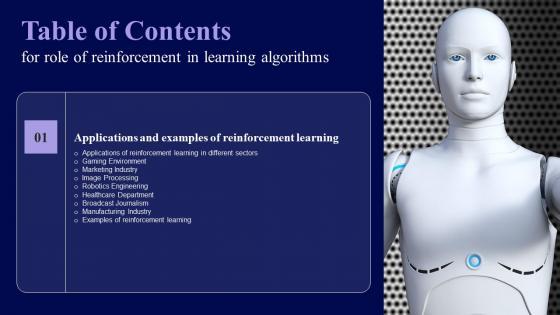 Are you in need of a template that can accommodate all of your creative concepts This one is crafted professionally and can be altered to fit any style. Use it with Google Slides or PowerPoint. Include striking photographs, symbols, depictions, and other visuals. Fill, move around, or remove text boxes as desired. Test out color palettes and font mixtures. Edit and save your work, or work with colleagues. Download Table Of Contents For Role Of Reinforcement In Learning Algorithms Portrait Pdf and observe how to make your presentation outstanding. Give an impeccable presentation to your group and make your presentation unforgettable. Our Table Of Contents For Role Of Reinforcement In Learning Algorithms Portrait Pdf are topically designed to provide an attractive backdrop to any subject. Use them to look like a presentation pro.