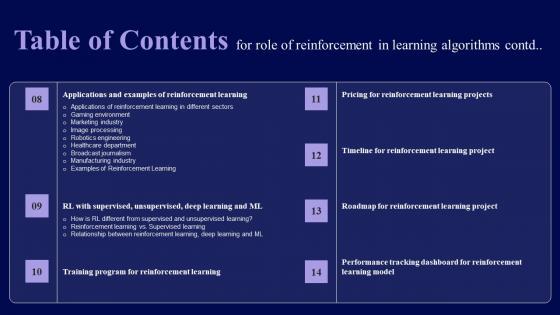 Find highly impressive G204 Table Of Contents For Role Of Reinforcement In Learning Algorithms Template Pdf on Slidegeeks to deliver a meaningful presentation. You can save an ample amount of time using these presentation templates. No need to worry to prepare everything from scratch because Slidegeeks experts have already done a huge research and work for you. You need to download G204 Table Of Contents For Role Of Reinforcement In Learning Algorithms Template Pdf for your upcoming presentation. All the presentation templates are 100 percent editable and you can change the color and personalize the content accordingly. Download now. Our G204 Table Of Contents For Role Of Reinforcement In Learning Algorithms Template Pdf are topically designed to provide an attractive backdrop to any subject. Use them to look like a presentation pro.