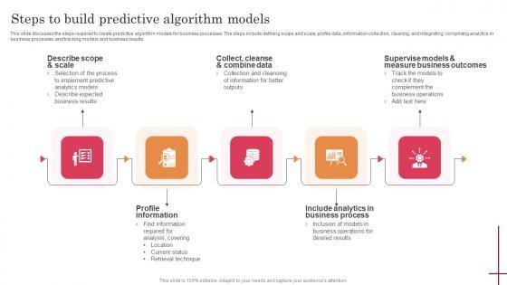 This slide discusses the steps required to create predictive algorithm models for business processes. The steps include defining scope and scale, profile data, information collection, cleaning, and integrating, comprising analytics in business processes, and tracking models and business results. Slidegeeks has constructed Predictive Analytics Methods Steps To Build Predictive Algorithm Models Themes PDF after conducting extensive research and examination. These presentation templates are constantly being generated and modified based on user preferences and critiques from editors. Here, you will find the most attractive templates for a range of purposes while taking into account ratings and remarks from users regarding the content. This is an excellent jumping off point to explore our content and will give new users an insight into our top notch PowerPoint Templates.