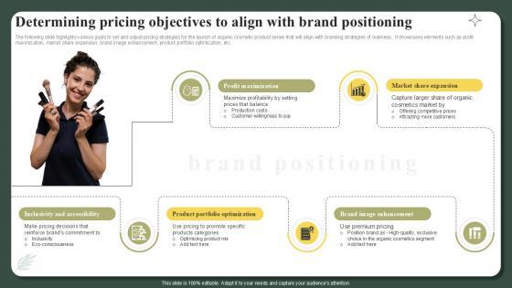 The following slide highlights various goals to set and adjust pricing strategies for the launch of organic cosmetic product series that will align with branding strategies of business,. It showcases elements such as profit maximization, market share expansion, brand image enhancement, product portfolio optimization, etc. If your project calls for a presentation, then Slidegeeks is your go-to partner because we have professionally designed, easy-to-edit templates that are perfect for any presentation. After downloading, you can easily edit Determining Pricing Objectives To Align With Brand Positioning Successful Launch Ppt Sample and make the changes accordingly. You can rearrange slides or fill them with different images. Check out all the handy templates The following slide highlights various goals to set and adjust pricing strategies for the launch of organic cosmetic product series that will align with branding strategies of business,. It showcases elements such as profit maximization, market share expansion, brand image enhancement, product portfolio optimization, etc.