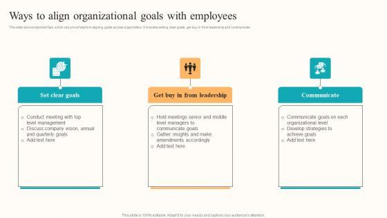 This slide shows important tips which can prove helpful in aligning goals across organization. It includes setting clear goals, get buy in from leadership and communicate Slidegeeks is one of the best resources for PowerPoint templates. You can download easily and regulate Ways To Align Organizational Developing Employee Centric Marketing Program Sample Pdf for your personal presentations from our wonderful collection. A few clicks is all it takes to discover and get the most relevant and appropriate templates. Use our Templates to add a unique zing and appeal to your presentation and meetings. All the slides are easy to edit and you can use them even for advertisement purposes. This slide shows important tips which can prove helpful in aligning goals across organization. It includes setting clear goals, get buy in from leadership and communicate