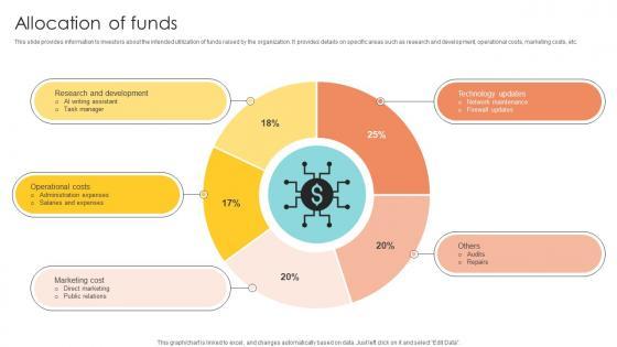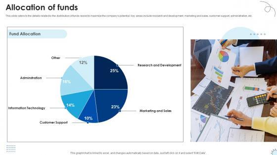 This slide caters to the details related to the distribution of funds raised to maximize the companys potential. Key areas include research and development, marketing and sales, customer support, administration, etc. Find a pre-designed and impeccable Allocation Of Funds Technology Solutions Provider Investor Funding Elevator Pitch Deck. The templates can ace your presentation without additional effort. You can download these easy-to-edit presentation templates to make your presentation stand out from others. So, what are you waiting for Download the template from Slidegeeks today and give a unique touch to your presentation. This slide caters to the details related to the distribution of funds raised to maximize the companys potential. Key areas include research and development, marketing and sales, customer support, administration, etc.