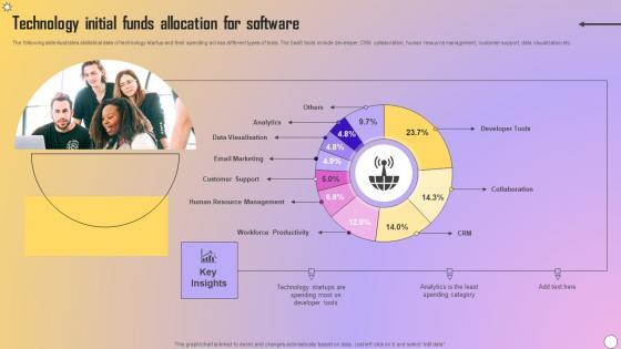 The following slide illustrates statistical data of technology startup and their spending across different types of tools. The SaaS tools include developer, CRM collaboration, human resource management, customer support, data visualization etc. Pitch your topic with ease and precision using this Technology Initial Funds Allocation For Software Elements Pdf. This layout presents information on Analytics, Data Visualisation, Email Marketing. It is also available for immediate download and adjustment. So, changes can be made in the color, design, graphics or any other component to create a unique layout. The following slide illustrates statistical data of technology startup and their spending across different types of tools. The SaaS tools include developer, CRM collaboration, human resource management, customer support, data visualization etc.