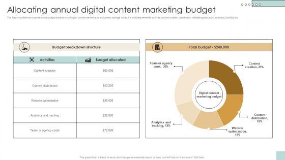 The following slide showcases annual budget breakdown of digital content marketing to accurately manage funds. It It includes elements such as content creation, distribution, website optimization, analytics, tracking etc. Create an editable Allocating Annual Digital Content Marketing Budget Developing And Creating Digital Content Strategy SS V that communicates your idea and engages your audience. Whether you are presenting a business or an educational presentation, pre-designed presentation templates help save time. Allocating Annual Digital Content Marketing Budget Developing And Creating Digital Content Strategy SS V is highly customizable and very easy to edit, covering many different styles from creative to business presentations. Slidegeeks has creative team members who have crafted amazing templates. So, go and get them without any delay. The following slide showcases annual budget breakdown of digital content marketing to accurately manage funds. It It includes elements such as content creation, distribution, website optimization, analytics, tracking etc.