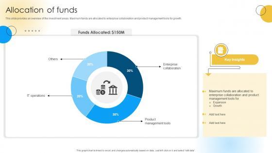 This slide provides an overview of the investment areas. Maximum funds are allocated to enterprise collaboration and product management tools for growth. Find a pre-designed and impeccable Allocation Of Funds Software Development Company Funding Elevator Pitch Deck. The templates can ace your presentation without additional effort. You can download these easy-to-edit presentation templates to make your presentation stand out from others. So, what are you waiting for Download the template from Slidegeeks today and give a unique touch to your presentation. This slide provides an overview of the investment areas. Maximum funds are allocated to enterprise collaboration and product management tools for growth.