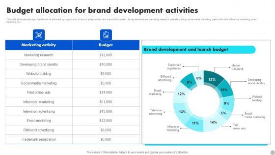 This slide showcases budget that should be allocated by organization to launch and promote new brand in the market. Its key elements are marketing research, website building, social media marketing, paid online ads, influencer marketing, email marketing etc From laying roadmaps to briefing everything in detail, our templates are perfect for you. You can set the stage with your presentation slides. All you have to do is download these easy-to-edit and customizable templates. Budget Allocation For Brand Development Activities Launching New Product Brand Microsoft Pdf will help you deliver an outstanding performance that everyone would remember and praise you for. Do download this presentation today. This slide showcases budget that should be allocated by organization to launch and promote new brand in the market. Its key elements are marketing research, website building, social media marketing, paid online ads, influencer marketing, email marketing etc