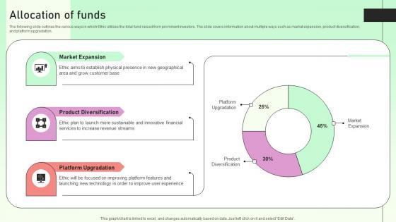 The following slide outlines the various ways in which Ethic utilizes the total fund raised from prominent investors. The slide covers information about multiple ways such as market expansion, product diversification,and platform upgradation. Boost your pitch with our creative Allocation Of Funds Value Based Investor Financing Pitch Deck Introduction Pdf. Deliver an awe inspiring pitch that will mesmerize everyone. Using these presentation templates you will surely catch everyones attention. You can browse the ppts collection on our website. We have researchers who are experts at creating the right content for the templates. So you do not have to invest time in any additional work. Just grab the template now and use them. The following slide outlines the various ways in which Ethic utilizes the total fund raised from prominent investors. The slide covers information about multiple ways such as market expansion, product diversification,and platform upgradation.