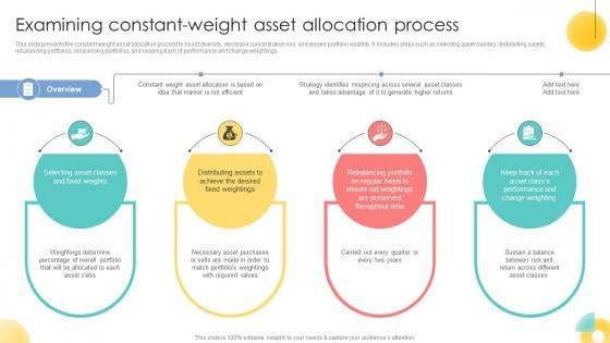 This slide presents the constant weight asset allocation process to boost diversity, decrease concentration risk, and lessen portfolio volatility. It includes steps such as selecting asset classes, distributing assets,rebalancing portfolios, rebalancing portfolios, and keeping track of performance and change weightings.Crafting an eye-catching presentation has never been more straightforward. Let your presentation shine with this tasteful yet straightforward Examining Constant Weight Asset Allocation Process Strategic Investment Plan For Optimizing Risk SS V template. It offers a minimalistic and classy look that is great for making a statement. The colors have been employed intelligently to add a bit of playfulness while still remaining professional. Construct the ideal Examining Constant Weight Asset Allocation Process Strategic Investment Plan For Optimizing Risk SS V that effortlessly grabs the attention of your audience Begin now and be certain to wow your customers This slide presents the constant weight asset allocation process to boost diversity, decrease concentration risk, and lessen portfolio volatility. It includes steps such as selecting asset classes, distributing assets,rebalancing portfolios, rebalancing portfolios, and keeping track of performance and change weightings.