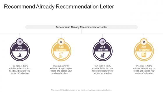 Introducing our well designed Recommend Already Recommendation Letter In Powerpoint And Google Slides Cpb. This PowerPoint design presents information on topics like Recommend Already Recommendation Letter. As it is predesigned it helps boost your confidence level. It also makes you a better presenter because of its high quality content and graphics. This PPT layout can be downloaded and used in different formats like PDF, PNG, and JPG. Not only this, it is available in both Standard Screen and Widescreen aspect ratios for your convenience. Therefore, click on the download button now to persuade and impress your audience. Our Recommend Already Recommendation Letter In Powerpoint And Google Slides Cpb are topically designed to provide an attractive backdrop to any subject. Use them to look like a presentation pro.