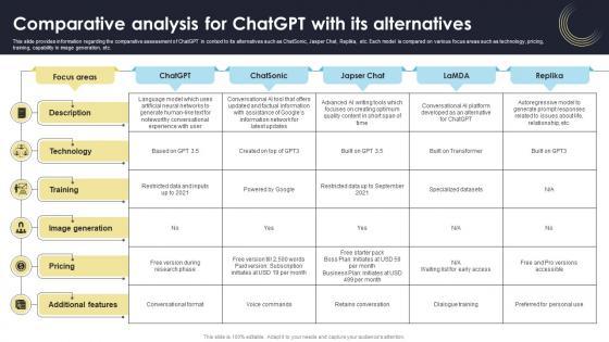 This slide provides information regarding the comparative assessment of ChatGPT in context to its alternatives such as ChatSonic, Jasper Chat, Replika, etc. Each model is compared on various focus areas such as technology, pricing, training, capability in image generation, etc. Do you have to make sure that everyone on your team knows about any specific topic I yes, then you should give Comparative Analysis For ChatGPT With Its Alternatives How Generative AI Tools Work AI SS V a try. Our experts have put a lot of knowledge and effort into creating this impeccable Comparative Analysis For ChatGPT With Its Alternatives How Generative AI Tools Work AI SS V. You can use this template for your upcoming presentations, as the slides are perfect to represent even the tiniest detail. You can download these templates from the Slidegeeks website and these are easy to edit. So grab these today This slide provides information regarding the comparative assessment of ChatGPT in context to its alternatives such as ChatSonic, Jasper Chat, Replika, etc. Each model is compared on various focus areas such as technology, pricing, training, capability in image generation, etc.