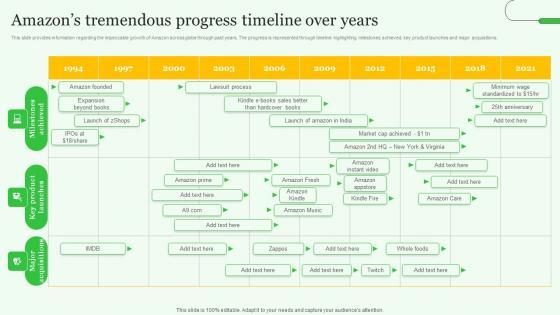 This slide provides information regarding the impeccable growth of Amazon across globe through past years. The progress is represented through timeline highlighting milestones achieved, key product launches and major acquisitions. Create an editable Amazons Tremendous Progress Timeline Over Years Amazons Journey For Becoming Designs PDF that communicates your idea and engages your audience. Whether you are presenting a business or an educational presentation, pre-designed presentation templates help save time. Amazons Tremendous Progress Timeline Over Years Amazons Journey For Becoming Designs PDF is highly customizable and very easy to edit, covering many different styles from creative to business presentations. Slidegeeks has creative team members who have crafted amazing templates. So, go and get them without any delay. This slide provides information regarding the impeccable growth of Amazon across globe through past years. The progress is represented through timeline highlighting milestones achieved, key product launches and major acquisitions.