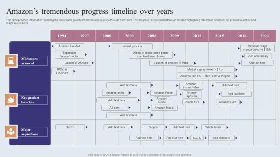This slide provides information regarding the impeccable growth of Amazon across globe through past years. The progress is represented through timeline highlighting milestones achieved, key product launches and Major acquisitions. Do you have an important presentation coming up Are you looking for something that will make your presentation stand out from the rest Look no further than Amazons Tremendous Progress Timeline Over Years Graphics PDF. With our professional designs, you can trust that your presentation will pop and make delivering it a smooth process. And with Slidegeeks, you can trust that your presentation will be unique and memorable. So why wait Grab Amazons Tremendous Progress Timeline Over Years Graphics PDF today and make your presentation stand out from the rest