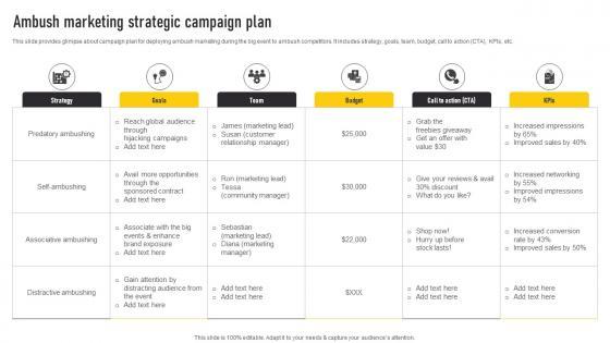This slide provides glimpse about campaign plan for deploying ambush marketing during the big event to ambush competitors. It includes strategy, goals, team, budget, call to action CTA, KPIs, etc. Welcome to our selection of the Ambush Marketing Strategic Campaign Plan Sample PDF. These are designed to help you showcase your creativity and bring your sphere to life. Planning and Innovation are essential for any business that is just starting out. This collection contains the designs that you need for your everyday presentations. All of our PowerPoints are 100 percent editable, so you can customize them to suit your needs. This multi purpose template can be used in various situations. Grab these presentation templates today.
