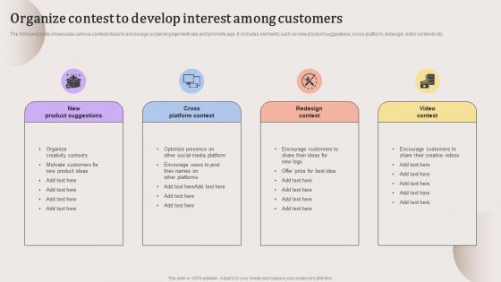 The following slide showcases various contest ideas to encourage social engagement rate and promote app. It includes elements such as new product suggestions, cross platform, redesign, video contests etc. Make sure to capture your audiences attention in your business displays with our gratis customizable Organize Contest To Develop Interest Among Customers Download Pdf. These are great for business strategies, office conferences, capital raising or task suggestions. If you desire to acquire more customers for your tech business and ensure they stay satisfied, create your own sales presentation with these plain slides. The following slide showcases various contest ideas to encourage social engagement rate and promote app. It includes elements such as new product suggestions, cross platform, redesign, video contests etc.