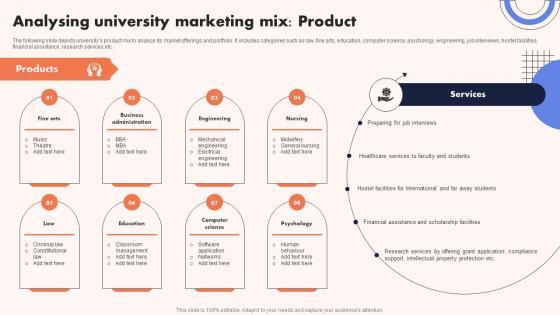 The following slide depicts universitys product mix to analyze its market offerings and portfolio. It includes categories such as law, fine arts, education, computer science, psychology, engineering, job interviews, hostel facilities, financial assistance, research services, etc. Get a simple yet stunning designed Analysing University Marketing Mix Product Higher Education Ppt Slides Strategy SS V. It is the best one to establish the tone in your meetings. It is an excellent way to make your presentations highly effective. So, download this PPT today from Slidegeeks and see the positive impacts. Our easy-to-edit Analysing University Marketing Mix Product Higher Education Ppt Slides Strategy SS V can be your go-to option for all upcoming conferences and meetings. So, what are you waiting for Grab this template today. The following slide depicts universitys product mix to analyze its market offerings and portfolio. It includes categories such as law, fine arts, education, computer science, psychology, engineering, job interviews, hostel facilities, financial assistance, research services, etc.