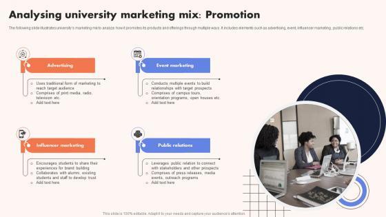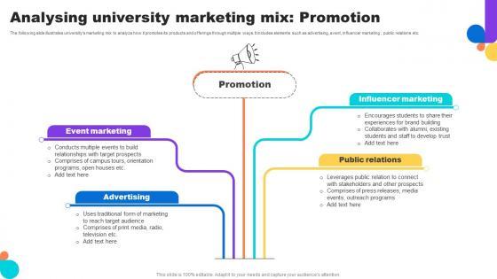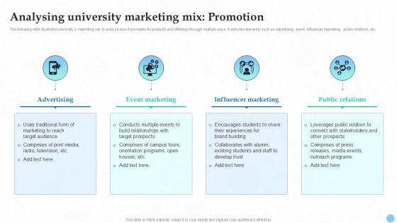 The following slide illustrates universitys marketing mix to analyze how it promotes its products and offerings through multiple ways. It includes elements such as advertising, event, influencer marketing , public relations etc.Get a simple yet stunning designed Analysing University Marketing Mix Promotion Key Step To Implementation University Strategy SS V. It is the best one to establish the tone in your meetings. It is an excellent way to make your presentations highly effective. So, download this PPT today from Slidegeeks and see the positive impacts. Our easy-to-edit Analysing University Marketing Mix Promotion Key Step To Implementation University Strategy SS V can be your go-to option for all upcoming conferences and meetings. So, what are you waiting for Grab this template today. The following slide illustrates universitys marketing mix to analyze how it promotes its products and offerings through multiple ways. It includes elements such as advertising, event, influencer marketing , public relations etc.
