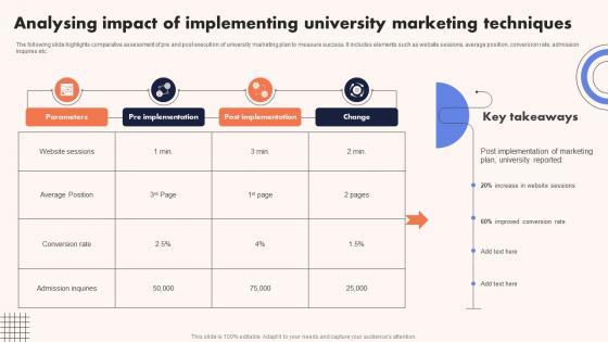 The following slide highlights comparative assessment of pre and post execution of university marketing plan to measure success. It includes elements such as website sessions, average position, conversion rate, admission inquires etc. Present like a pro with University Marketing Guide Analysing Impact Of Implementing University Strategy SS V. Create beautiful presentations together with your team, using our easy-to-use presentation slides. Share your ideas in real-time and make changes on the fly by downloading our templates. So whether you are in the office, on the go, or in a remote location, you can stay in sync with your team and present your ideas with confidence. With Slidegeeks presentation got a whole lot easier. Grab these presentations today. The following slide highlights comparative assessment of pre and post execution of university marketing plan to measure success. It includes elements such as website sessions, average position, conversion rate, admission inquires etc.