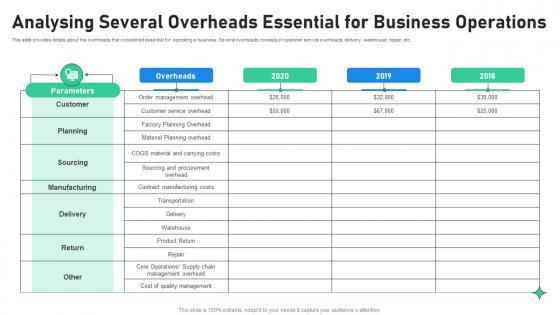 This slide provides details about the overheads that considered essential for operating a business. Several overheads consists of customer service overheads, delivery, warehouse, repair, etc. Boost your pitch with our creative Analysing Several Overheads Essential For Increasing Profitability Through Better Product. Deliver an awe-inspiring pitch that will mesmerize everyone. Using these presentation templates you will surely catch everyones attention. You can browse the ppts collection on our website. We have researchers who are experts at creating the right content for the templates. So you do not have to invest time in any additional work. Just grab the template now and use them. This slide provides details about the overheads that considered essential for operating a business. Several overheads consists of customer service overheads, delivery, warehouse, repair, etc.