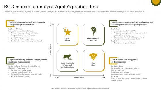 This slide provides information regarding BCG matrix to assess existing Apples product line. The planning tool helps to assess firms products and services to decide what offerings to keep, sell or invest more in. Slidegeeks is one of the best resources for PowerPoint templates. You can download easily and regulate BCG Matrix To Analyse Apples Product Line Designs PDF for your personal presentations from our wonderful collection. A few clicks is all it takes to discover and get the most relevant and appropriate templates. Use our Templates to add a unique zing and appeal to your presentation and meetings. All the slides are easy to edit and you can use them even for advertisement purposes.