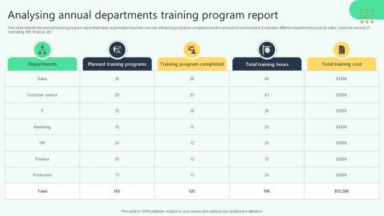 This slide exhibits the annual training program report that helps organization track the number of training programs completed and the amount of cost invested. It includes different departments such as sales, customer service, IT, marketing, HR, finance, etc. Slidegeeks is one of the best resources for PowerPoint templates. You can download easily and regulate Analysing Annual Departments Training Program Report Analysing Hr Data For Effective Decision Making for your personal presentations from our wonderful collection. A few clicks is all it takes to discover and get the most relevant and appropriate templates. Use our Templates to add a unique zing and appeal to your presentation and meetings. All the slides are easy to edit and you can use them even for advertisement purposes. This slide exhibits the annual training program report that helps organization track the number of training programs completed and the amount of cost invested. It includes different departments such as sales, customer service, IT, marketing, HR, finance, etc.