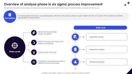 This slide shows introduction of analyse phase in six sigma process improvement for gaining insights about root cause. It includes description, major goals and main tools, etc. The Overview Of Analyse Phase In DMAIC Methodology To Maintain PPT Sample is a compilation of the most recent design trends as a series of slides. It is suitable for any subject or industry presentation, containing attractive visuals and photo spots for businesses to clearly express their messages. This template contains a variety of slides for the user to input data, such as structures to contrast two elements, bullet points, and slides for written information. Slidegeeks is prepared to create an impression. This slide shows introduction of analyse phase in six sigma process improvement for gaining insights about root cause. It includes description, major goals and main tools, etc.