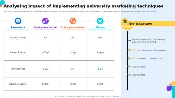 The following slide highlights comparative assessment of pre and post execution of university marketing plan to measure success. It includes elements such as website sessions, average position, conversion rate, admission inquires etc.Slidegeeks is one of the best resources for PowerPoint templates. You can download easily and regulate Analysing Impact Of Implementing University Marketing Key Step To Implementation University Strategy SS V for your personal presentations from our wonderful collection. A few clicks is all it takes to discover and get the most relevant and appropriate templates. Use our Templates to add a unique zing and appeal to your presentation and meetings. All the slides are easy to edit and you can use them even for advertisement purposes. The following slide highlights comparative assessment of pre and post execution of university marketing plan to measure success. It includes elements such as website sessions, average position, conversion rate, admission inquires etc.
