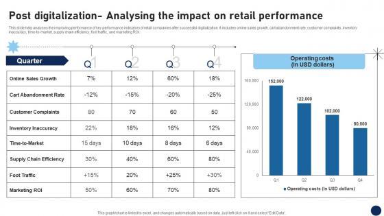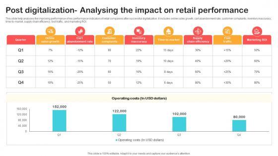This slide help analyses the improving performance of key performance indicators of retail companies after successful digitalization. It includes online sales growth, cart abandonment rate, customer complaints, inventory inaccuracy, time-to-market, supply chain efficiency, foot traffic, and marketing ROI. This modern and well-arranged Post Digitalization Analysing The Impact On Retail Performance DT SS V provides lots of creative possibilities. It is very simple to customize and edit with the Powerpoint Software. Just drag and drop your pictures into the shapes. All facets of this template can be edited with Powerpoint, no extra software is necessary. Add your own material, put your images in the places assigned for them, adjust the colors, and then you can show your slides to the world, with an animated slide included. This slide help analyses the improving performance of key performance indicators of retail companies after successful digitalization. It includes online sales growth, cart abandonment rate, customer complaints, inventory inaccuracy, time-to-market, supply chain efficiency, foot traffic, and marketing ROI.
