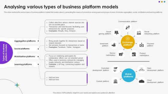 This slide mentions the various types of business platform models that creates value by generating the means of connections among users and groups of users. It includes aggregation, social, mobilization and learning platforms.There are so many reasons you need a Analysing Various Types Of Business Platform Models DT SS V. The first reason is you can not spend time making everything from scratch, Thus, Slidegeeks has made presentation templates for you too. You can easily download these templates from our website easily. This slide mentions the various types of business platform models that creates value by generating the means of connections among users and groups of users. It includes aggregation, social, mobilization and learning platforms.
