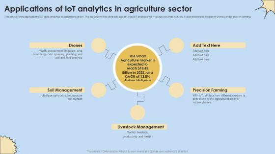 This slide shows application of IoT data analytics in agriculture sector. The purpose of this slide is to explain how IoT analytics will manage soil, livestock, etc. It also elaborates the use of drones and precision farming. Create an editable Applications Of IoT Analytics In Agriculture Sector Internet Of Things Analysis Background Pdf that communicates your idea and engages your audience. Whether you are presenting a business or an educational presentation, pre-designed presentation templates help save time. Applications Of IoT Analytics In Agriculture Sector Internet Of Things Analysis Background Pdf is highly customizable and very easy to edit, covering many different styles from creative to business presentations. Slidegeeks has creative team members who have crafted amazing templates. So, go and get them without any delay. This slide shows application of IoT data analytics in agriculture sector. The purpose of this slide is to explain how IoT analytics will manage soil, livestock, etc. It also elaborates the use of drones and precision farming.