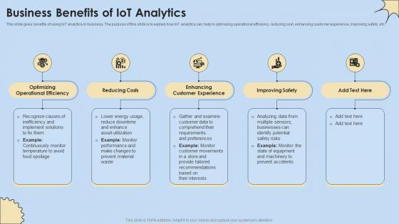 This slide gives benefits of using IoT analytics in business. The purpose of this slide is to explain how IoT analytics can help in optimizing operational efficiency, reducing cost, enhancing customer experience, improving safety, etc. Do you have an important presentation coming up Are you looking for something that will make your presentation stand out from the rest Look no further than Business Benefits Of IoT Analytics Internet Of Things Analysis Icons Pdf. With our professional designs, you can trust that your presentation will pop and make delivering it a smooth process. And with Slidegeeks, you can trust that your presentation will be unique and memorable. So why wait Grab Business Benefits Of IoT Analytics Internet Of Things Analysis Icons Pdf today and make your presentation stand out from the rest. This slide gives benefits of using IoT analytics in business. The purpose of this slide is to explain how IoT analytics can help in optimizing operational efficiency, reducing cost, enhancing customer experience, improving safety, etc.