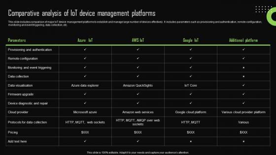 This slide includes comparison of major IoT device management platforms to establish and manage large number of devices effectively. It includes parameters such as provisioning and authentication, remote configuration, monitoring and event triggering, data collection, etc. If your project calls for a presentation, then Slidegeeks is your go-to partner because we have professionally designed, easy-to-edit templates that are perfect for any presentation. After downloading, you can easily edit IoT Device Management Fundamentals Comparative Analysis Of IoT Device Management Platforms IoT SS V and make the changes accordingly. You can rearrange slides or fill them with different images. Check out all the handy templates This slide includes comparison of major IoT device management platforms to establish and manage large number of devices effectively. It includes parameters such as provisioning and authentication, remote configuration, monitoring and event triggering, data collection, etc.