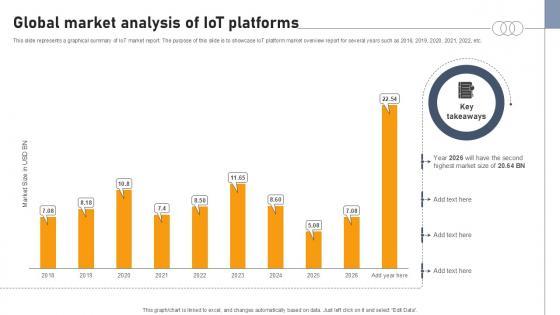 This slide represents a graphical summary of IoT market report. The purpose of this slide is to showcase IoT platform market overview report for several years such as 2018, 2019, 2020, 2021, 2022, etc. Are you in need of a template that can accommodate all of your creative concepts This one is crafted professionally and can be altered to fit any style. Use it with Google Slides or PowerPoint. Include striking photographs, symbols, depictions, and other visuals. Fill, move around, or remove text boxes as desired. Test out color palettes and font mixtures. Edit and save your work, or work with colleagues. Download Global Market Analysis Of IoT Platforms Exploring Google Cloud IoT Platform and observe how to make your presentation outstanding. Give an impeccable presentation to your group and make your presentation unforgettable. This slide represents a graphical summary of IoT market report. The purpose of this slide is to showcase IoT platform market overview report for several years such as 2018, 2019, 2020, 2021, 2022, etc.