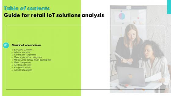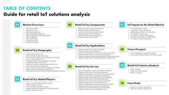 Slidegeeks is here to make your presentations a breeze with Guide For Retail IoT Solutions Analysis Table Of Contents Background Pdf With our easy to use and customizable templates, you can focus on delivering your ideas rather than worrying about formatting. With a variety of designs to choose from, you are sure to find one that suits your needs. And with animations and unique photos, illustrations, and fonts, you can make your presentation pop. So whether you are giving a sales pitch or presenting to the board, make sure to check out Slidegeeks first Our Guide For Retail IoT Solutions Analysis Table Of Contents Background Pdf are topically designed to provide an attractive backdrop to any subject. Use them to look like a presentation pro.