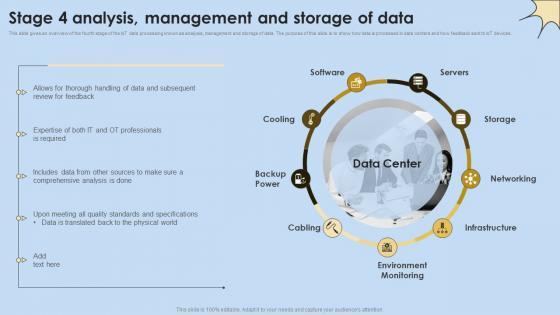 This slide gives an overview of the fourth stage of the IoT data processing known as analysis, management and storage of data. The purpose of this slide is to show how data is processed in data centers and how feedback sent to IoT devices. Boost your pitch with our creative Stage 4 Analysis Management And Storage Of Data Internet Of Things Analysis Ideas Pdf. Deliver an awe-inspiring pitch that will mesmerize everyone. Using these presentation templates you will surely catch everyones attention. You can browse the ppts collection on our website. We have researchers who are experts at creating the right content for the templates. So you do not have to invest time in any additional work. Just grab the template now and use them. This slide gives an overview of the fourth stage of the IoT data processing known as analysis, management and storage of data. The purpose of this slide is to show how data is processed in data centers and how feedback sent to IoT devices.