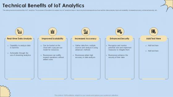 This slide gives technical benefits of IoT analytics. The purpose of this slide is to explain how IoT analytics helps in improving technical aspects such as real time data analysis, improved scalability, increased accuracy, enhanced security, etc. Slidegeeks is one of the best resources for PowerPoint templates. You can download easily and regulate Technical Benefits Of IoT Analytics Internet Of Things Analysis Summary Pdf for your personal presentations from our wonderful collection. A few clicks is all it takes to discover and get the most relevant and appropriate templates. Use our Templates to add a unique zing and appeal to your presentation and meetings. All the slides are easy to edit and you can use them even for advertisement purposes. This slide gives technical benefits of IoT analytics. The purpose of this slide is to explain how IoT analytics helps in improving technical aspects such as real time data analysis, improved scalability, increased accuracy, enhanced security, etc.