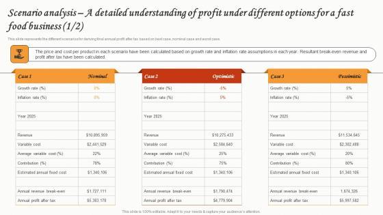 This slide represents the different scenarios for deriving final annual profit after tax based on best case, nominal case and worst case. Slidegeeks is here to make your presentations a breeze with Scenario Analysis A Detailed Understanding Of Profit Small Restaurant Business Download Pdf With our easy-to-use and customizable templates, you can focus on delivering your ideas rather than worrying about formatting. With a variety of designs to choose from, you are sure to find one that suits your needs. And with animations and unique photos, illustrations, and fonts, you can make your presentation pop. So whether you are giving a sales pitch or presenting to the board, make sure to check out Slidegeeks first. This slide represents the different scenarios for deriving final annual profit after tax based on best case, nominal case and worst case.