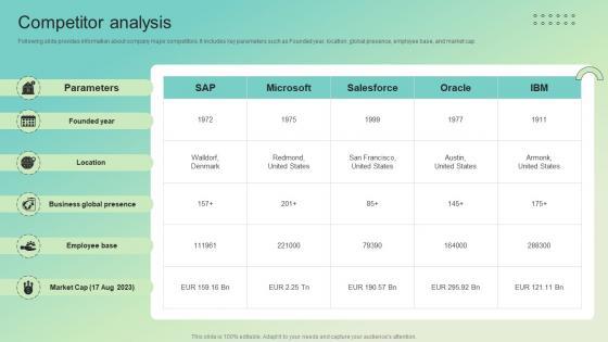 Following slide provides information about company major competitors. It includes key parameters such as Founded year, location, global presence, employee base, and market cap.Present like a pro with Competitor Analysis Enterprise Software Solution Providing Company Profile CP SS V. Create beautiful presentations together with your team, using our easy-to-use presentation slides. Share your ideas in real-time and make changes on the fly by downloading our templates. So whether you are in the office, on the go, or in a remote location, you can stay in sync with your team and present your ideas with confidence. With Slidegeeks presentation got a whole lot easier. Grab these presentations today. Following slide provides information about company major competitors. It includes key parameters such as Founded year, location, global presence, employee base, and market cap.