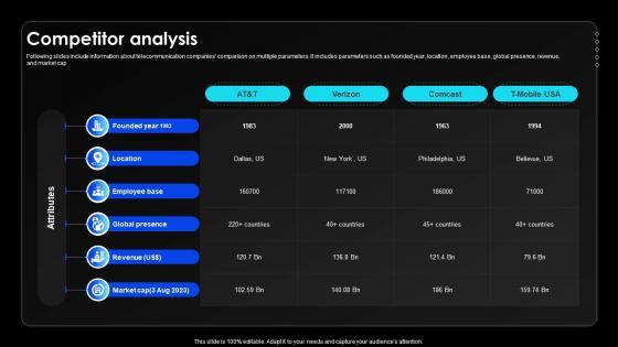 Following slides include information about telecommunication companies comparison on multiple parameters. It includes parameters such as founded year, location, employee base, global presence, revenue, and market capThere are so many reasons you need a Competitor Analysis Wireless Communication Services Provider Company Profile CP SS V. The first reason is you can not spend time making everything from scratch, Thus, Slidegeeks has made presentation templates for you too. You can easily download these templates from our website easily. Following slides include information about telecommunication companies comparison on multiple parameters. It includes parameters such as founded year, location, employee base, global presence, revenue, and market cap