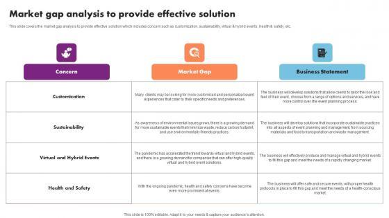 This slide covers the market gap analysis to provide effective solution which includes concern such as customization, sustainability, virtual and hybrid events, health and safety, etc. The best PPT templates are a great way to save time, energy, and resources. Slidegeeks have 100 percent editable powerpoint slides making them incredibly versatile. With these quality presentation templates, you can create a captivating and memorable presentation by combining visually appealing slides and effectively communicating your message. Download Market Gap Analysis Provide Effective Event Management Business Plan Go To Market Strategy Themes Pdf from Slidegeeks and deliver a wonderful presentation. This slide covers the market gap analysis to provide effective solution which includes concern such as customization, sustainability, virtual and hybrid events, health and safety, etc.